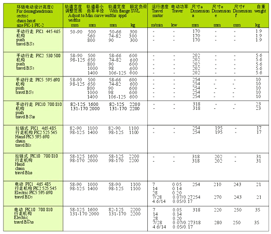 PK型环链电动葫芦采用各类行走机构,能完成直接和平面范围内的物料起重输送,行走轨道可以是普通工字钢,也可以是KPK标准轨道。 |